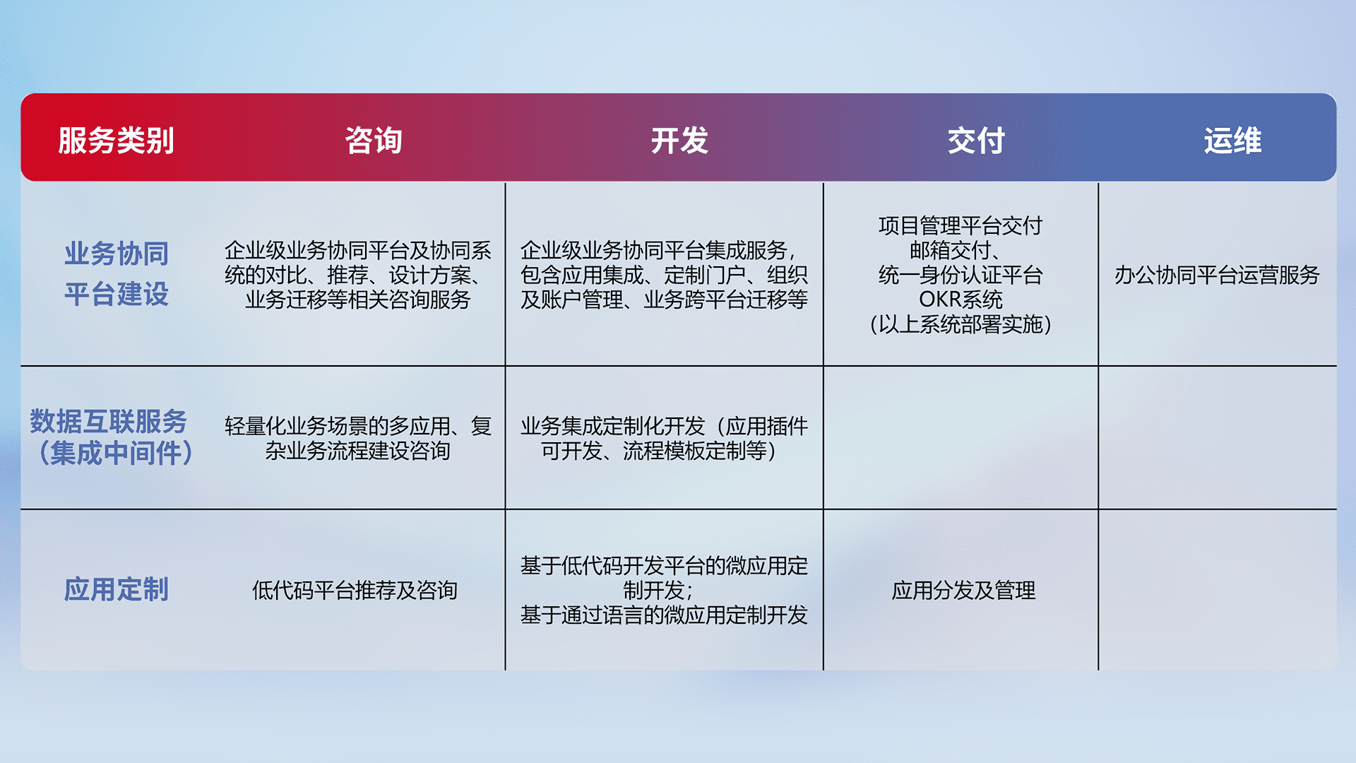 针对钉钉、、、、企微、、IDaas等平台级产品提供产品的规划、、、、方案、、、交付、、定制化开发等服务,,实现如统一协同办公、、、、智能客户服务、、、混合会议管理、、、智能数据查询、、、、等业务场景,,,实现数字化转型。。。。